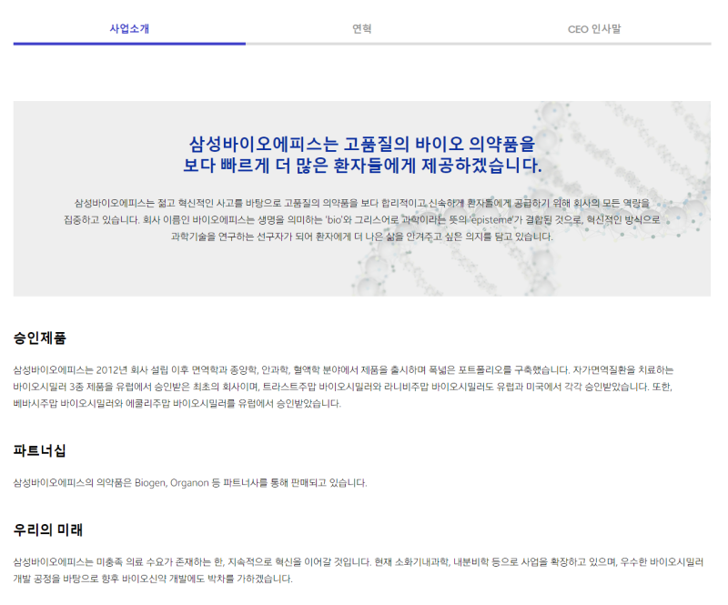 – 비전: 바이오 의약품 분야의 글로벌 리더로서, 인류 건강 증진에 기여