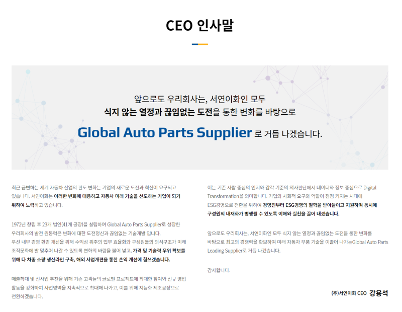 서연이화는 현대자동차, 기아자동차 등 국내 주요 자동차 제조사는 물론, 글로벌 자동차 브랜드에도 제품을 공급하며 그 기술력을 인정받고 있습니다.