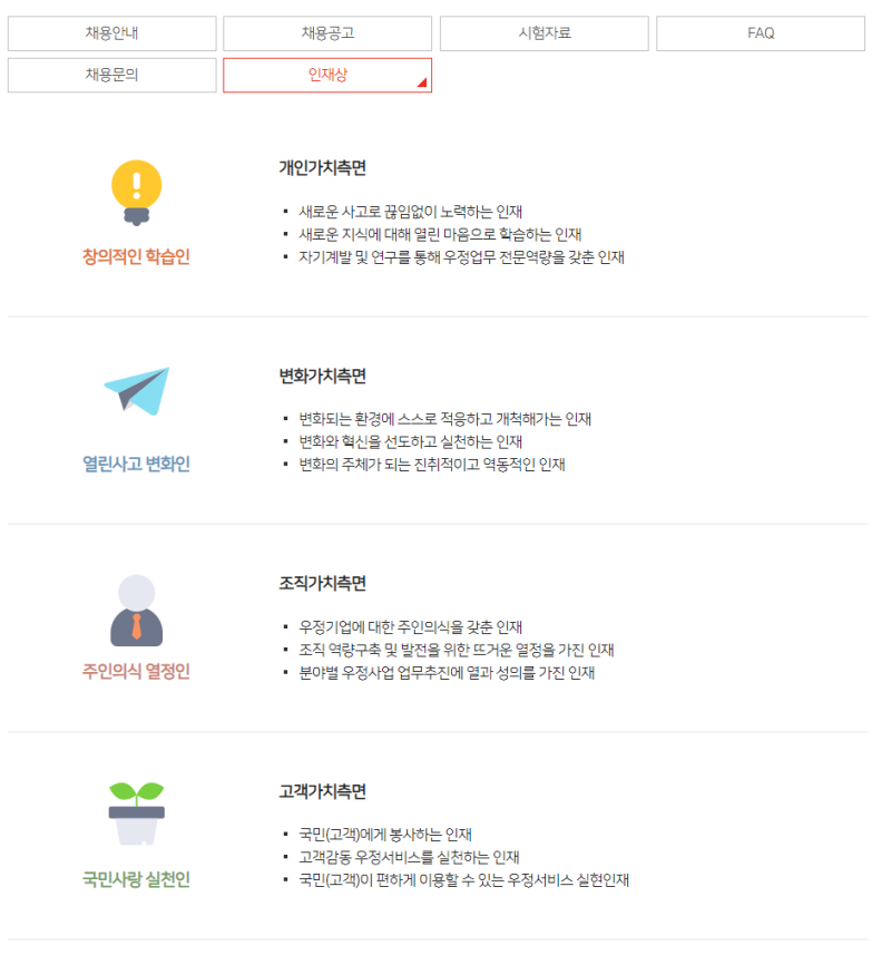 - 봉사 정신 및 고객 중심 마인드: 국민을 위한 헌신과 서비스를 최우선으로 생각하는 사람