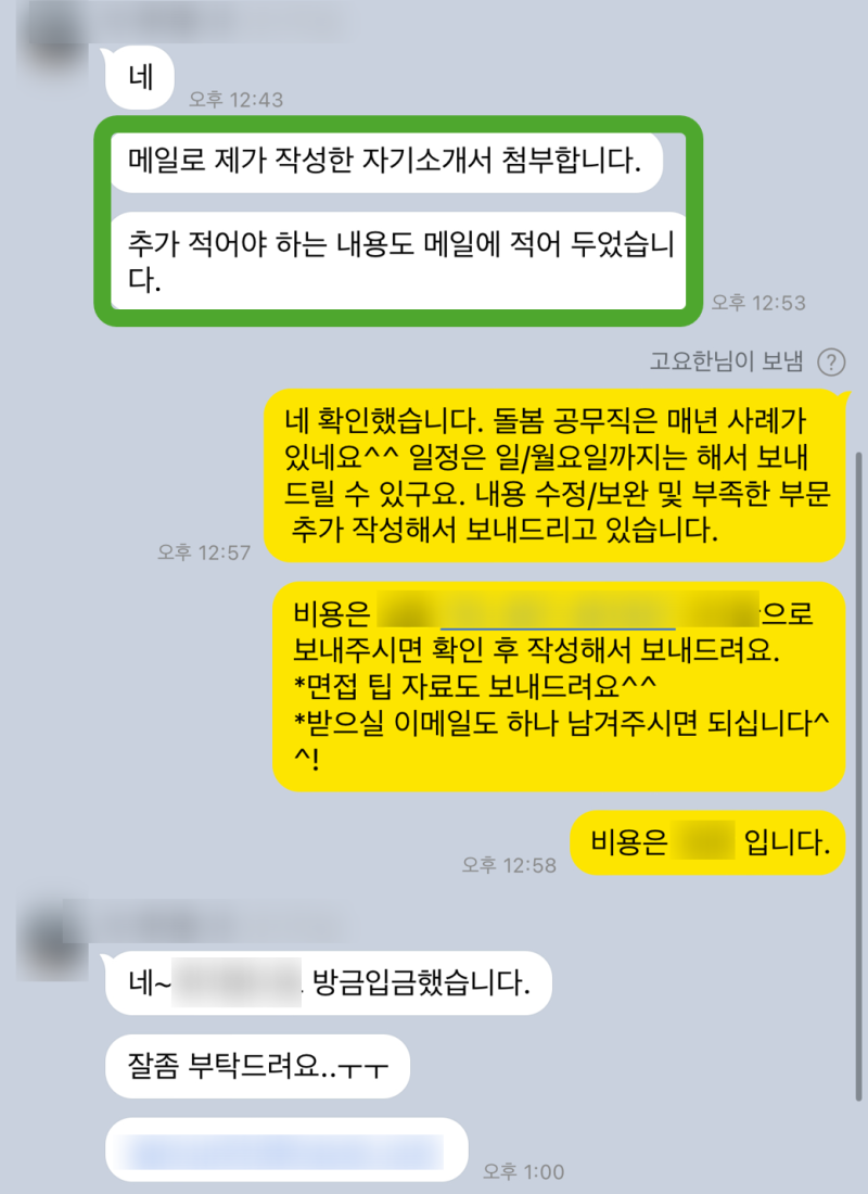 맞춤 컨설팅 진행 (수정, 첨삭, 대필 등)