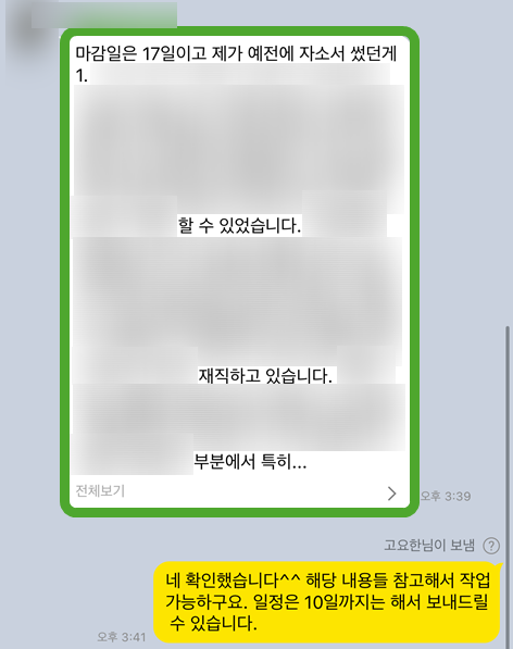 >> 완성된 자기소개서를 최종적으로 검토하며, 오탈자, 비문 등을 꼼꼼히 확인하고 지원자분께 실전 면접에서도 자신감 있게 답변할 수 있도록 추가적인 조언을 드렸습니다.