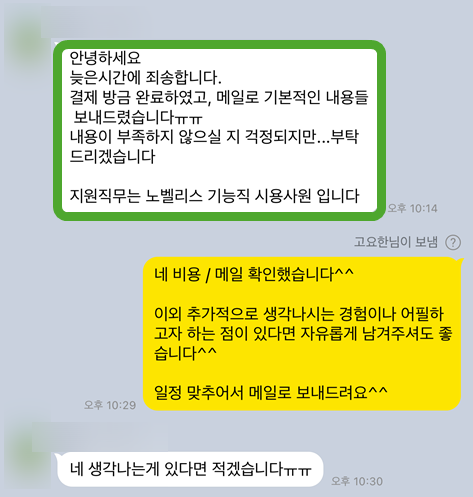 >> 최종 제출 전에 모든 문항의 일관성과 흐름을 다시 한번 점검하고, 오탈자 및 비문이 없는지 최종적으로 확인했습니다. 김OO 지원자분은 이전 자소서와 완전히 달라진 내용과 표현에 매우 만족하셨고, 자신감을 얻어 면접에 임하셨습니다.