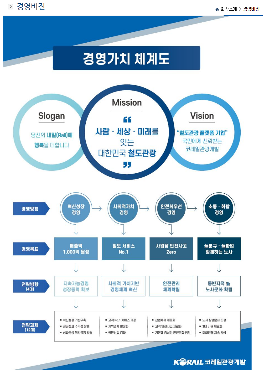 [코레일관광개발] 분석자료 (핵심가치, 비전, 인재상, 각종 사업 등) 📊