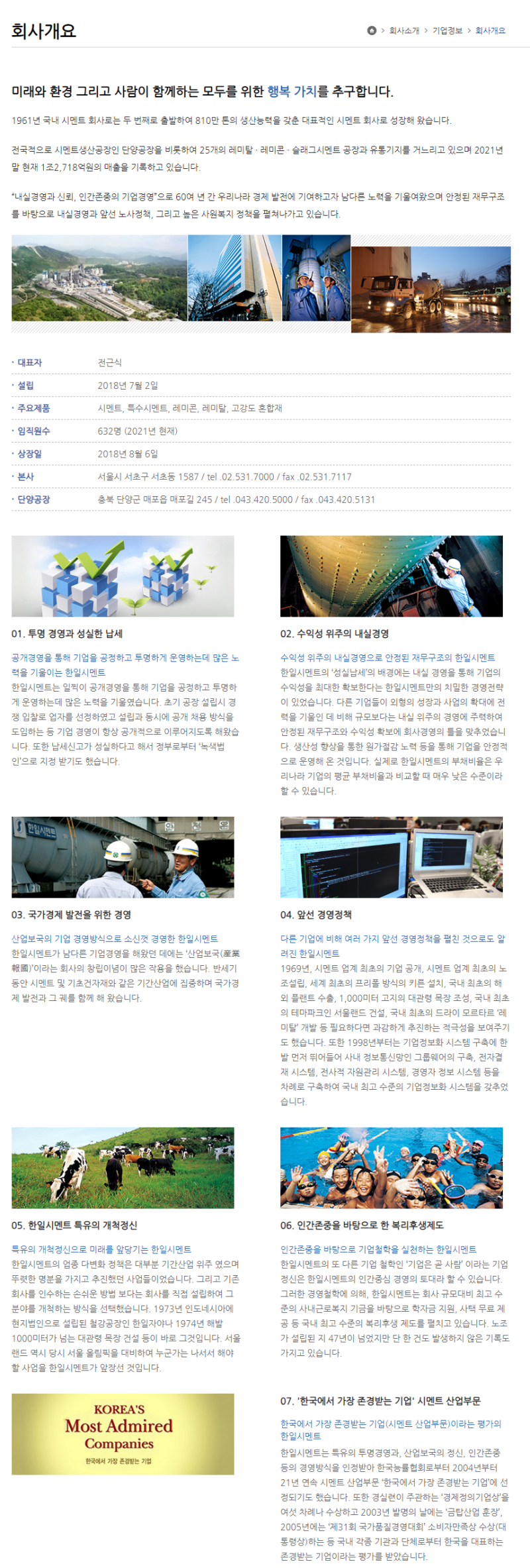 한일시멘트 분석 자료 (핵심 가치, 비전, 인재상)